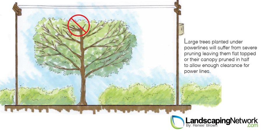 If overhead utilities exist on your site, make sure your planting is well away from the lines. This requires a knowledge of how large a tree will be at maturity to ensure there is enough clearance. Otherwise you will suffer the tragic practical pruning of trees that leaves them flat topped or the canopy cut in half to allow lines to travel through unencumbered.
