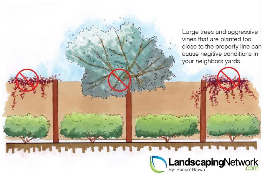 Large trees, shrubs and vines on property lines are the bane of city public works and the money makers for lawyers and tree trimmers. The potential size of a large tree at maturity is enough to negatively influence conditions in your neighbors' yards. It may shed litter, produce hazardous branches, send roots under the fence to invade the lawn, and present a dozen other common problems that crop up on property lines. And if your neighbor has a swimming pool, consider this doubly important.