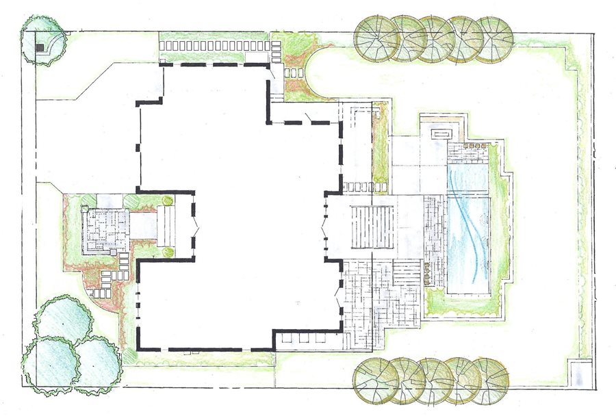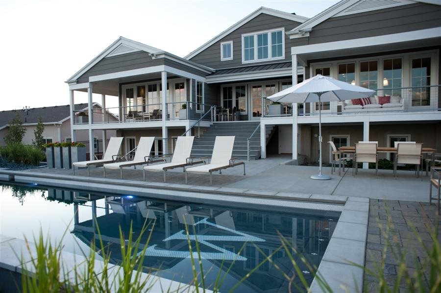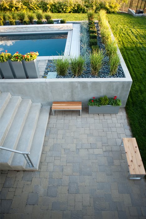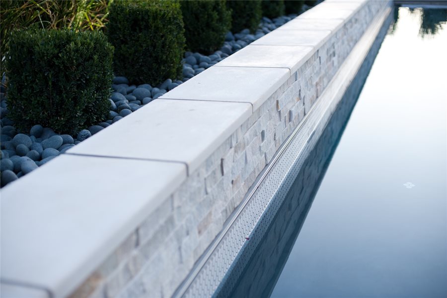 The home's coastal modern aesthetic was carried into the landscape in a variety of ways. "Mass plantings of cube boxwood, and grasses along the pool help to achieve a modern style," says Hansen. Mexican beach pebbles cover the ground around these plants. "We choose the pebbles because the gray/black color is so consistent, they are easy on bare feet and don't make a mess like bark," she recalls. In keeping with the modern styling, the pool features clean, straight lines which also made it possible for an automatic pool cover to be installed, providing an added safety convenience for the family. A low wall covered in a light ledger stone runs along the rear length of the pool. "This wall was designed with three waterfalls, but the clients eliminated them due to maintenance concerns. We decided to keep the wall for its visual interest and texture," explains Hansen. The waterline tile was selected to match the ledger stone and a dark plaster was used to mimic the water color of the inspiration pool.