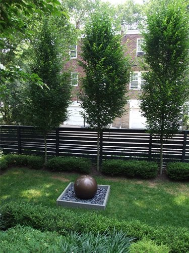 The homeowner opted for a unique horizontal fence style that catered to her contemporary tastes. "The horizontal fence boards mimic brick and stone patterns present on the exterior of the home," she explains. While still creating privacy, the openings between boards keep the space from feeling totally enclosed. Hasenecz chose to stain the fence black because she wanted it to serve as a dramatic backdrop for the plants she selected.
