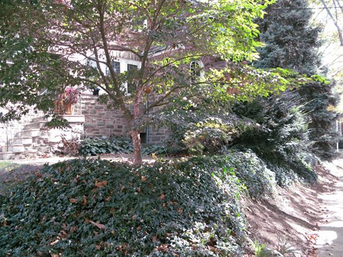 Taming the SlopeAnother problem that Hasenecz solved was the overgrown slope. Without room in the client's budget for retaining walls, she elected to use plants to hold the hillside in place. "We tore out most of the existing groundcover, keeping the ivy in some spots," she explains. Then new plants, including Carex, Variegated Dogwood and Hostas, were added to stabilize the slope and create aesthetic appeal.