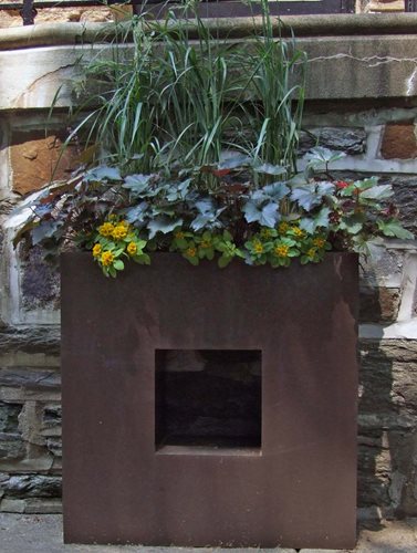 Hasenecz took color cues from the stone on the exterior of the home. "The home is clad with Wissahikon schist, a local variety of stone with variable, metallic colors," she says. These colors inspired the selection of the bronze finish for fountain and containers used in the garden.