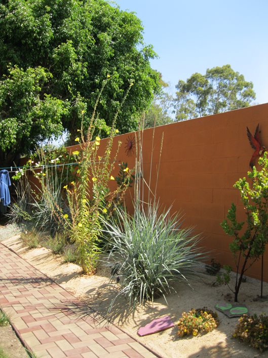 "This garden used to be completely lawn," says Nayeri. "The homeowners selected edible kumquat, citrus, and pomegranate, and we put in a native planting of sages, foothill penstemon, monkey flower, and more." Nayeri points out that many municipalities will actually pay you to remove your lawn. "If they provide one dollar per square foot of lawn you remove, that's potentially an extra thousand dollars you could put towards your new landscaping."