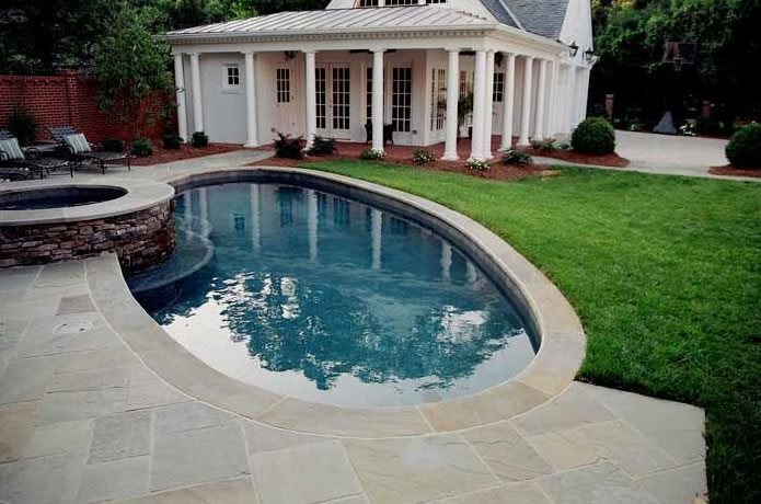 Strive to preserve trees both on and off site. Your neighbor's trees may provide the perfect background for your structure if it is well positioned, reducing the demand to plant and maintain your own. On-site trees and existing older hardscape elements if appropriate should also be preserved as part of the site planning process to save money because both of these are expensive and time consuming to replace. Often, such elements can dictate the overall size and shape of a pool house when it must be designed with respect to crowding or problematic existing conditions.