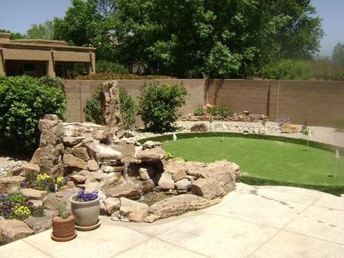 Most backyard putting greens are created with artificial turf, because mounds, sand pits, and interesting shapes can be hard to irrigate and mow effectively if you use living turfgrass. Artificial turf also has an even surface that’s ideal for putting. Synthetic greens are virtually maintenance free. They're able to withstand hot or cold temperatures, as well as wet conditions, and are just about always ready for play.