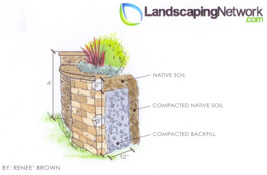 Second, a retaining wall must have properly compacted backfill. Backfill refers to the dirt behind the wall. In order to provide proper drainage, at least 12 inches of granular backfill (gravel or a similar aggregate) should be installed directly behind the wall. Compacted native soil can be used to backfill the rest of the space behind the wall. If you intend to do landscaping behind the wall, a 6+ inch layer of native soil should also be placed over the gravel fill.