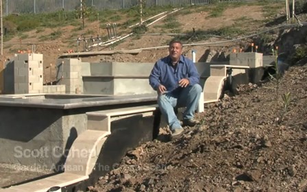 See how retaining walls made of cinderblock topped with travertine can be used to add structure and beauty to a sloped landscape.
