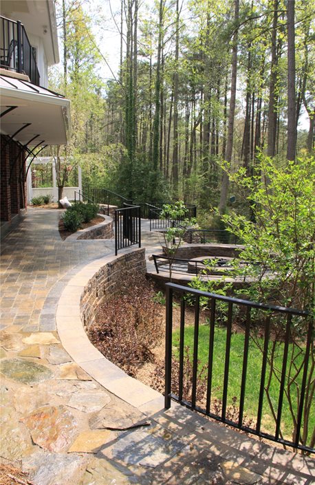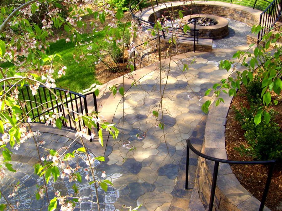 - Paving: Hanson Hardscapes Forest Hill Cobble (upper level, fire pit and dining patios), Unilock Trevia (central landing)