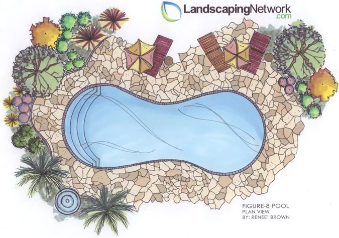Figure-8 shaped pools are great for families or those who want a pool to work for many activities. One end of a figure-8 pool does not necessarily have to be a mirror image in size of the other end. The figure-8 provides a nice separation for an obvious shallow area and a separate deeper area. For families, young children can enjoy activities in the shallow area with obvious perception of where the deeper area begins. The indentations on each side of the figure-8 are also natural spots for shrubbery.