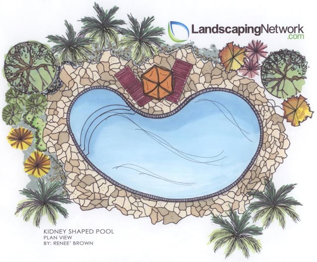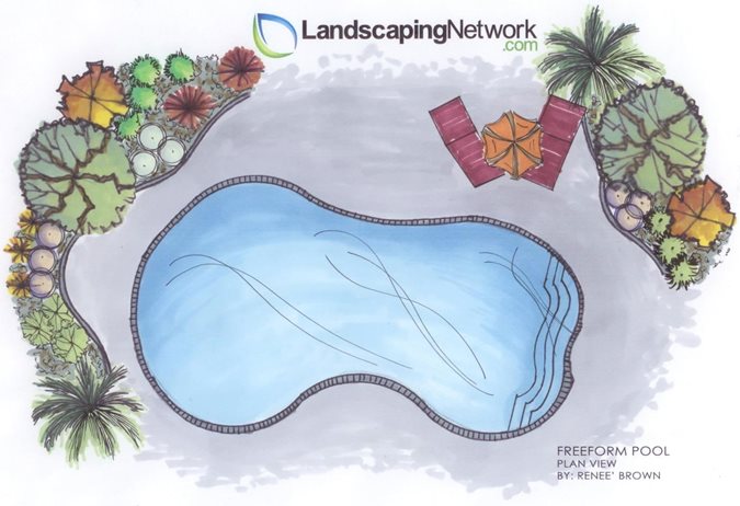 A freeform pool can take on virtually any curvilinear shape (except circles or other rounded geometric patterns). Many times, a kidney-shaped pool is considered free-form. However, the kidney shape has become more standard over the years. A truly free-form design does not adhere to any typical pool design patterns. It is typically designed around elements in nature or to blend with nature. It also is chosen for incorporating landscaping elements such as providing inlets into the pool area for palm trees or shrubbery.