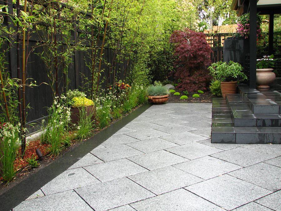 "The main goal for this garden was to create a contemplative space in which to reflect and feel serenity," says Barbara. In order to achieve this, privacy had to be created. A two-fold approach was taken: installing privacy fencing and screening with plants. The fence, designed by the architect, is a completely solid barrier that encloses both the front and back portions of the garden. Behind the home, the height of the fence was extended with open lattice work and a densely planted line of black bamboo enhances the privacy further. In the front yard, and along the side of the property, specimen Japanese maples and a weeping cherry also add to the sense of enclosure and serve as focal points from within the garden and the house.