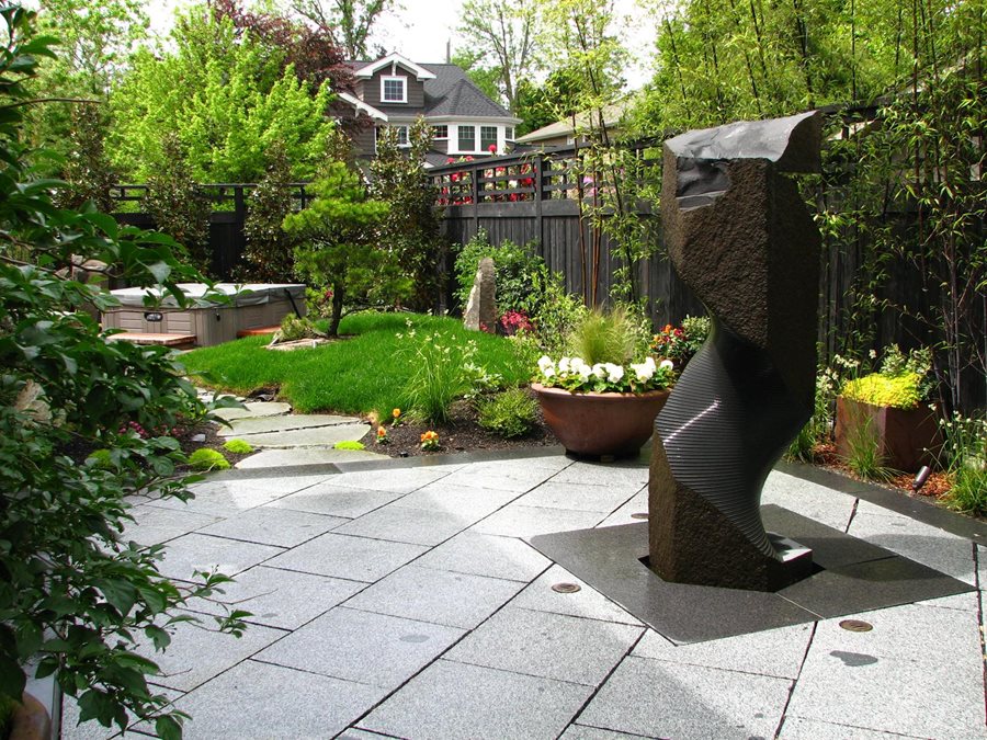 With three water features, this garden stays true to the Japanese style, which uses water symbolically and for cleansing. When you enter the front gate you are greeted by a rock waterfall and small pond, which provides a focal point and ambient sound. As you follow the path past the waterfall and around the corner of the house you will find a column water feature made from stones quarried in Eastern Washington. “We drilled and plumbed the columns so that water would gather in the basins, gently spill over the face of the stones and return to a nearly invisble rock-filled pond,” explains Barbara. The third water feature is an upright stone sculpture found in the center of the granite patio. The homeowners had purchased this piece and asked Stock & Hill to incorporate it into the garden. The twisting shape of the massive stone reveals ridges over which the water slowly flows. This is a disappearing water feature, with the reservoir hidden beneath the patio. At night, lights integrated into the paving dramatically illuminate the feature.