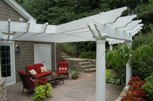 This small front patio and pergola in Lancaster, MA provides a relaxing haven. When Deb Perrault of Fieldstone Design came on the scene the homeowners wanted to improve their front entrance and upgrade their railroad tie paths.