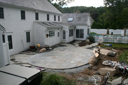 The main patio flooring is a full-color natural cleft bluestone in random pattern, a strong and durable stone that is 2” thick and will easily stand up to New England winters. An antique granite millwheel was inlaid in the patio that designates the cover of the septic cleanout. It was necessary to build a portion of the patio over the septic distribution box to achieve the design.