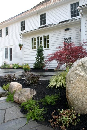 “The spaces between the new walkways created planting beds where I introduced large boulders. Strategically positioned, these large boulders create an organic feel that complements the natural setting,” Christopher recalls. In the beds he also added low-maintenance plant materials that are staples in any New England landscape, such as Dwarf Weeping Japanese Maple, Hydrangea, Ornamental Grasses, and Coneflowers. In time, various low-growing perennials, including Japanese Blood Grass, Creeping phlox, and Coreopsis, will grow around the base of the boulders and create a flawless look.