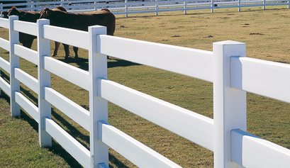 This four rail high end vinyl fence manufactured by CertainTeed fence features its innovative CertaGrain texture that is much more like real wood than smooth surface designs. Strong enough to stand up to livestock, and with the additional rail it can be used for more than just horses and cattle. This vinyl fence is also available in a brown Sierra Blend color for ranches utilizing a more naturalistic color palette.