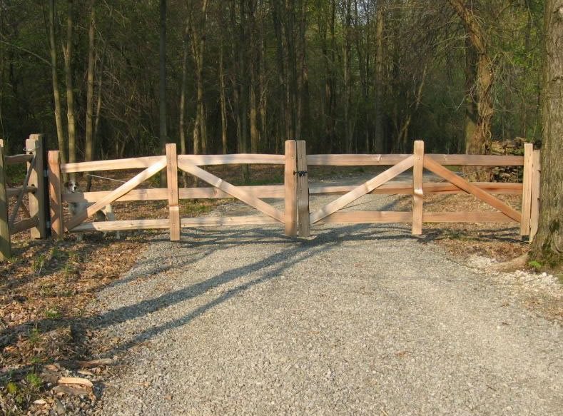 For the farm, ranch or estate seeking traditional rough entry road gate, Hoover Fence provides top quality wood gates to match their cedar split rail fences. Large gates such as this which must span two lanes of traffic can be heavy and difficult to construct. Those shipped from Hoover may be assembled on site and stained to match any wood fence system. They are also engineered to work better with automatic opening systems. When the gate is the first thing your visitor sees when they reach your property, a well crafted beautifully designed choice is worth every penny.
