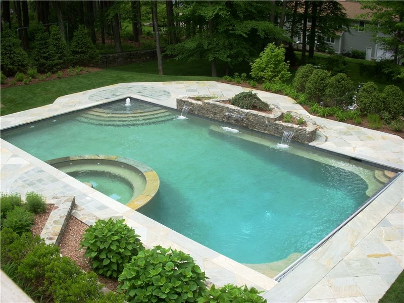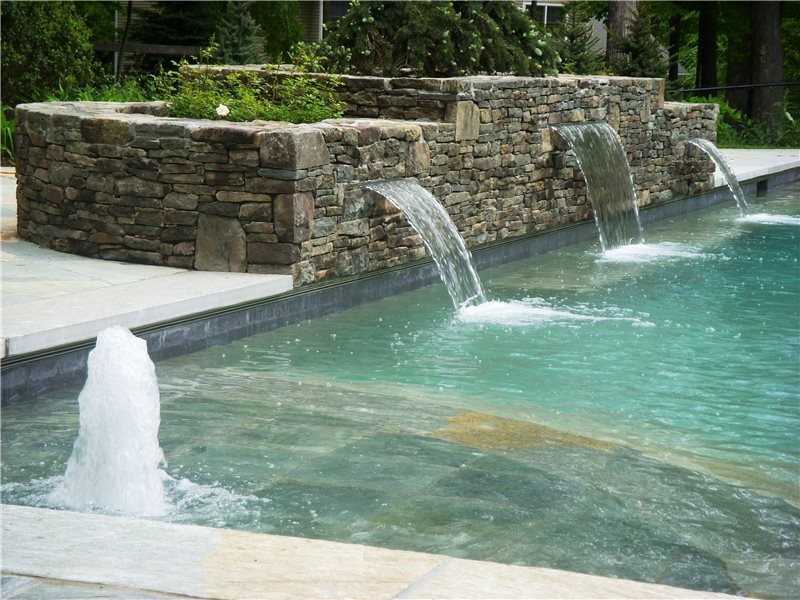 An aerial shot of the pool and spa. "I think we provided a fun, sophisticated area for both the adults and children. The spa is for all ages, especially the adults. The play jet and bench under the waterfalls are especially fun for the kids," says landscape architect Bill Einhorn of LDAW Landscape Architecture, Carmel, N.Y.
