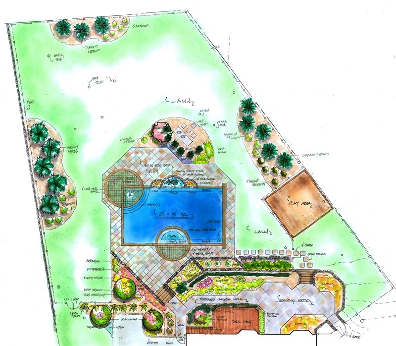 - Features: In-ground swimming pool, spa, sheer-descent waterfalls, terraced retaining wall, wood deck