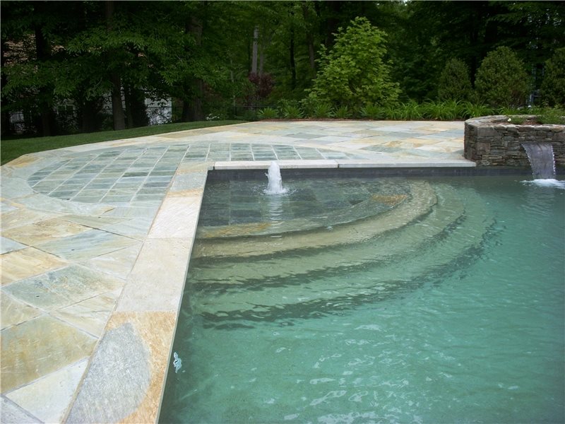 The pool is enhanced by a trio of sheer-descent falls and a play jet at the entry steps into the pool. The waterfalls cascade over a built-in bench the length of the pool for the children to sit under.