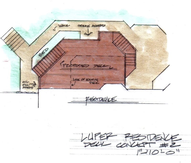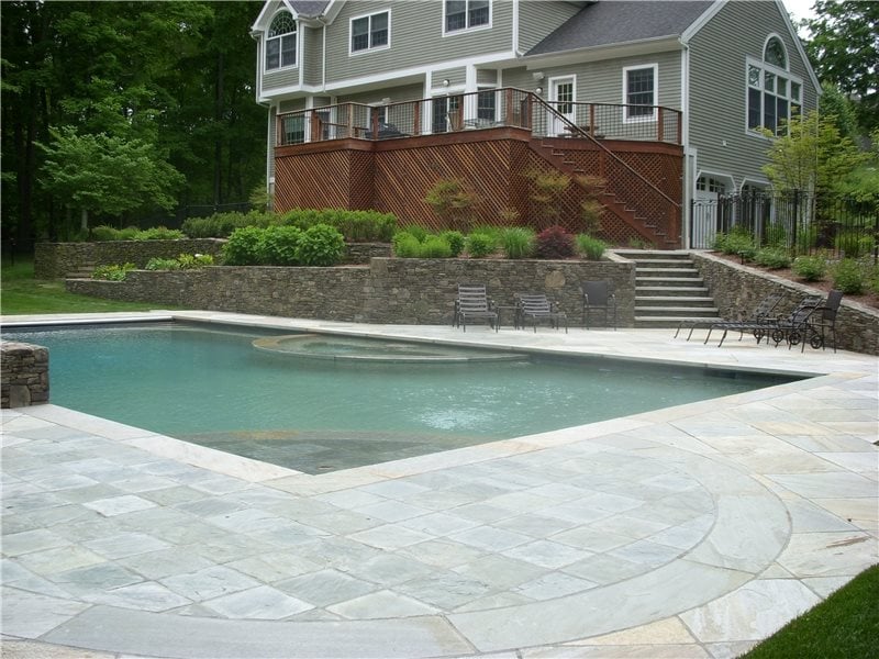 The homeowners wanted a new wood deck (shown in the background) with storage space below for furniture. Two stairways were incorporated into the design so people can access both sides of the property from the deck. A 5-foot retaining wall, built of Pennsylvania fieldstone, corrected a steep slope from the house to the pool site.