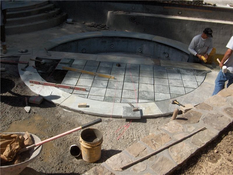 The circular coping for the spa is being installed. The spa was built within the pool so it could be covered by an automatic safety cover.