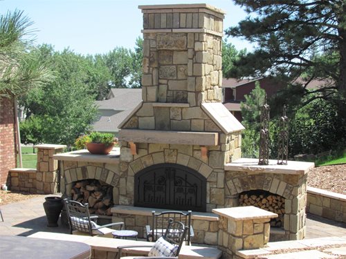 Here all the bells and whistles are integrated into a stone face outdoor fireplace. They feature soldier course at the top of the chimney, the recessed niche on the front, a heavy mantle, extra wide firebox, and two openings for wood storage.
