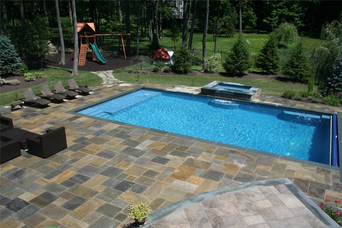 Traditional pools are the most common. They usually have a classic shape such as rectangular or kidney. The coping on a Traditional swimming pool is distinct, with brick or paving stones outlining the perimeter visually. Timeless paving materials are using for decking, think brick, pavers or natural stone. Many traditional pools feature a raised spa that spills over into the pool. Typically, the water color is that of a natural lake or pond.