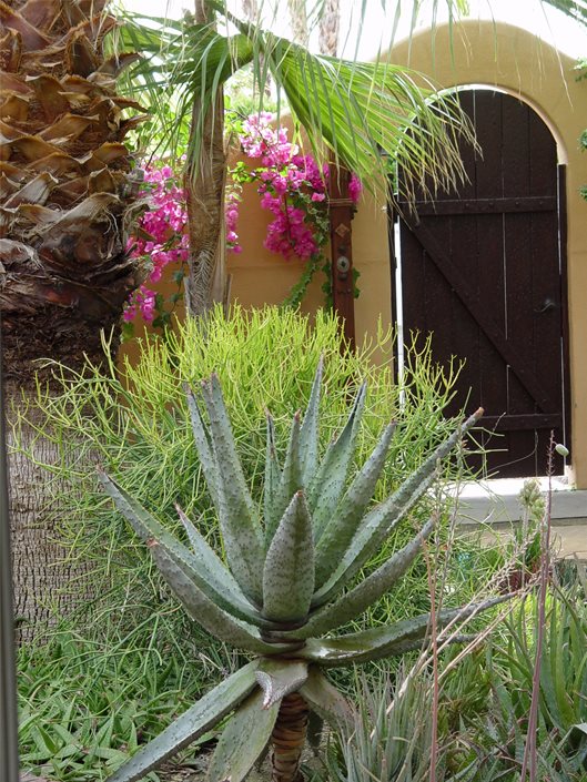 This newly remodeled home features drought resistant planting combined with specimen succulents in large pots. The large head of arborescent Aloe bainsii rises above the courtyard wall to provide visual drama against the stack-stone background. Outside a Beaucarnea with its enlarged trunk fits into this nook in the architecture where visitors can appreciate its unique shape and dangling foliage. Just two well selected and perfectly placed succulents provides this entry with the drama it deserves both in the day, and at night when creatively lighted.