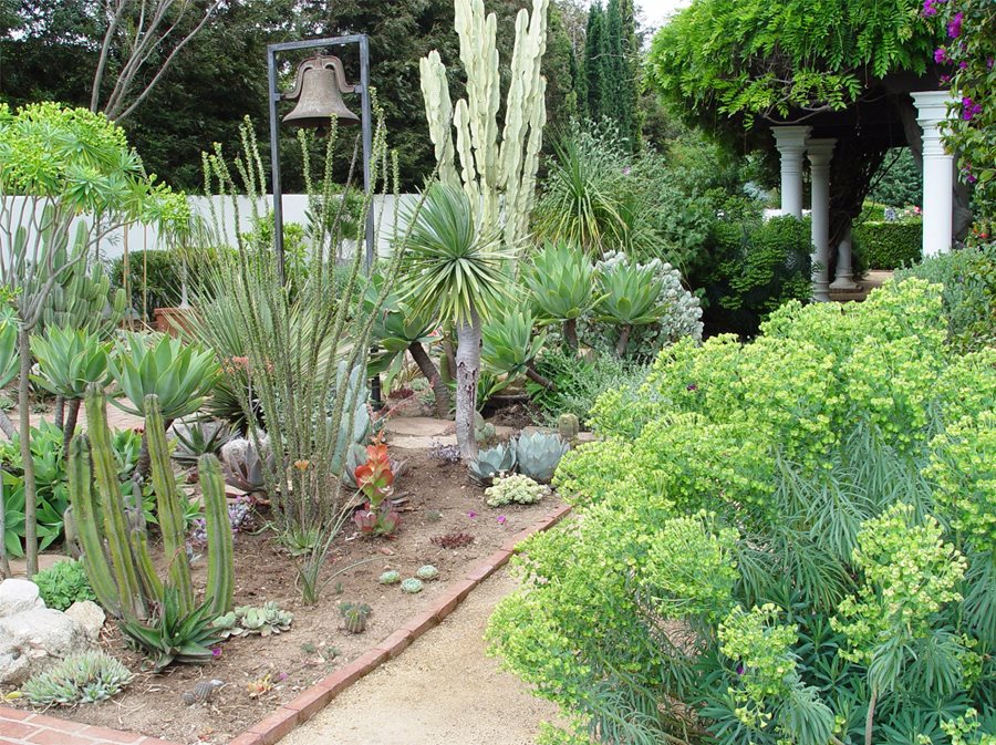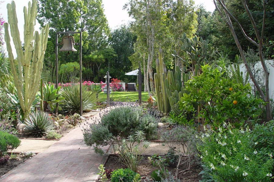 Succulent gardens are the perfect adjunct to Mediterranean style plantings. This four square garden with its brick pathways integrates citrus and Spanish lavender into the landscape of succulents with similar water demands. The square on the right side has less evaporation due to shade and the proximity of a masonry wall, so here broadleaf plants are grouped with a few succulents. Opposite, the full sun square is exclusively succulents featuring Agave attenuata, desert spoon and a tall variegated Euphorbia ingens.