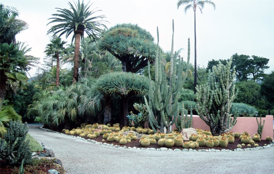 Succulent plants become far more dramatic whenever they are grown against a high contrast background. The pink coloring of this Mediterranean style home makes each cactus and euphorbia appear more like sculpture than living plants. This is key to design for large homes that require monumental specimens for instant drama. Integrating barrel cactus in the ground plane without compromising root zones of the larger plants ensures that every species in this entire composition receives the perfect amount of water without risk of rot at the soil line caused by overly wet conditions.