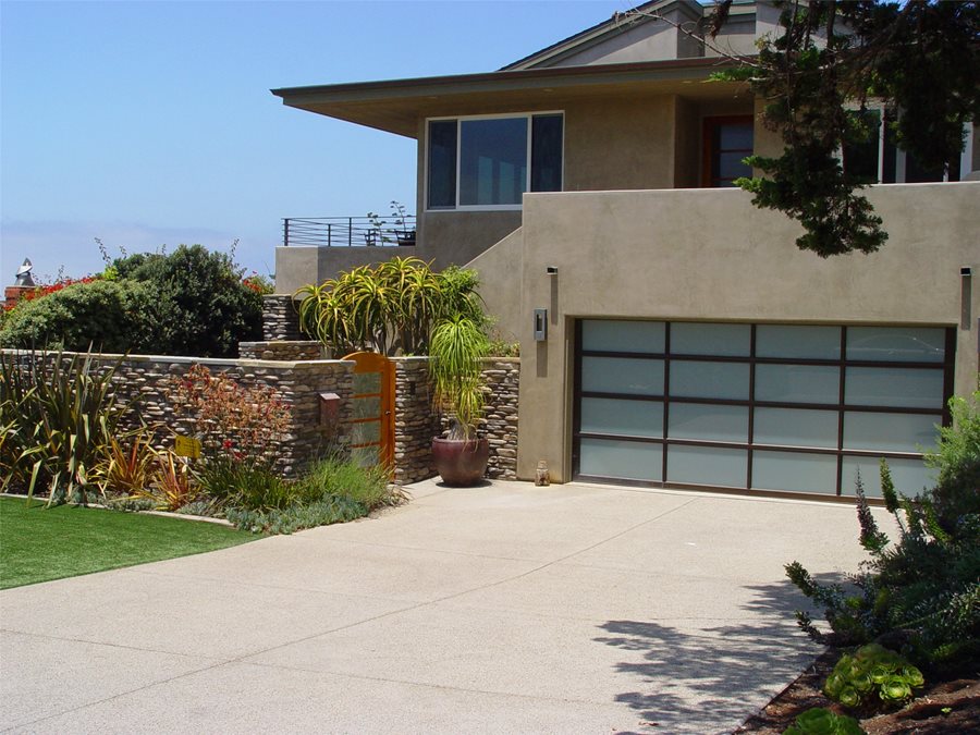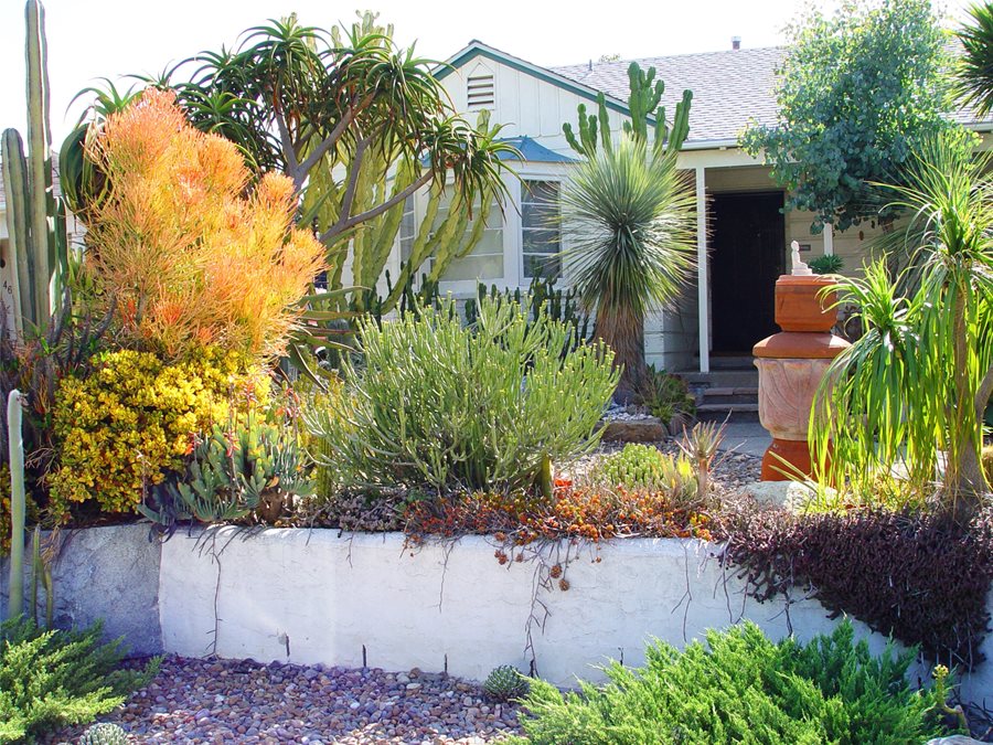 This bungalow in an old neighborhood shows how succulent plants love elevation above the surrounding ground plain. The euphorbias, aloes and firesticks provide screening from the street and traveling sedums cascade down the wall face. This is an example of a collector-style landscape where the diversity of species is more important than the whole panorama. This is popular style in coastal California where owners strive to create unique contrasts in color and form all year around.