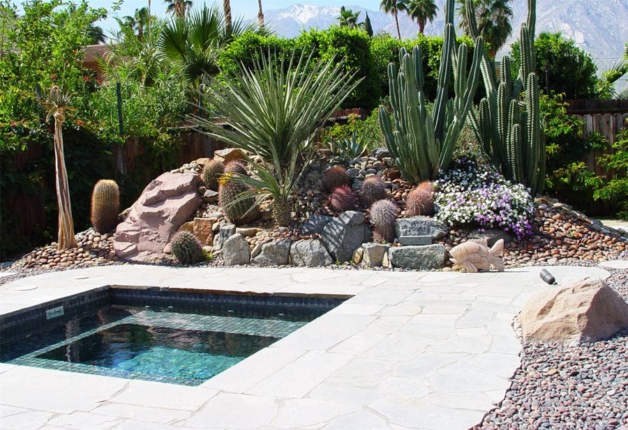 Success with succulents demands well drained soil, and in the desert foothills this site sits close to bedrock. Here is a problem solving mound that functions both as a background for the spa and a high, dry place for growing moisture sensitive native succulent desert plants. Integration of boulders helps to maintain the shape of the mound and reduce the amount of space needed to achieve such a high elevation. The application of gravel and other stones keeps the overly steep walls from eroding onto the paving.
