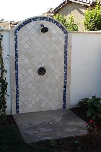 An outdoor shower allows swimmers to rinse off after a dip in the pool or spa.