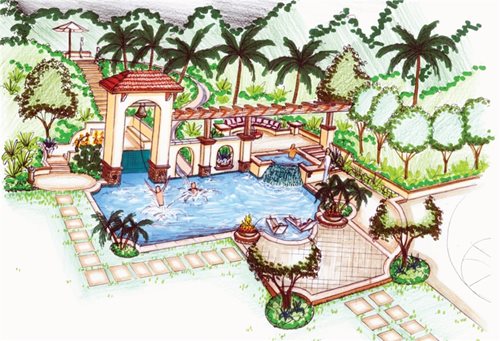 A perspective drawing of the pool and surrounding landscape.
