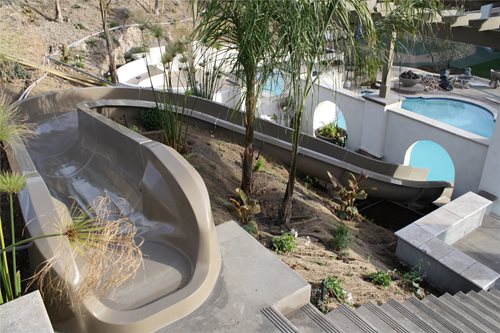 Fun & GamesOne of the most unique aspects of this project is the bell tower and rope swing. Cohen adapted this idea from a swing supported by bamboo posts which the clients had enjoyed in Hawaii. "The tower took extensive structural engineering and is 32 feet tall," Cohen recalls. It rises 18 feet above the water level, plunges through 8 feet of water and extends 6 feet below the pool shell, making it a sturdy structure that will be safe for swinging for years to come. Swingers can jump from a four foot platform just behind the bell tower and swing out into the deep end of the pool. The bell tower was roofed with terra cotta tiles to carry on the Spanish Hacienda theme. White stucco, simulated stone veneer and cobalt blue tiles complete the look. The fun in this pool doesn't stop with the swing, there is also a 40 foot long slide that comes down the hill and into the water.