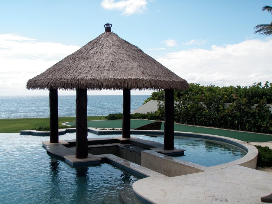 Natural thatch and synthetic thatch must both be looked at. Natural thatch does not do well on a roof that is too shallow, has poor ventilation or is in a humid climate. A dry, hot and windy climate is best for natural thatch. Keep in mind that natural thatch does produce small pieces of debris that may need to be pressure washed from the roof and then swept or blown from the pool deck. On the other hand, synthetic thatch requires much less maintenance, but it does have two draw backs in that it is expensive in the short term and is not always as aesthetically pleasing as natural thatch. There are aesthetic advancements being made in synthetic thatch products and we are getting closer to the natural thatch look every year. - Do plan out the area inside your hut.
