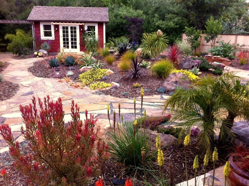 - Don't be afraid to exchange your water-hogging lawn for a colorful Mediterranean-inspired landscape. "An established landscape uses half as much water as a lawn, and takes so much less care," Frank points out. "Plus, creating garden rooms or different environments makes your space more versatile and fun to use."
