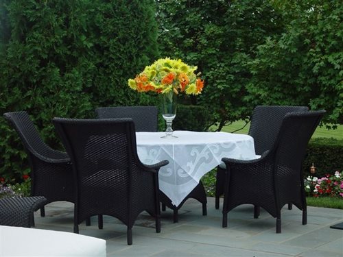 A clipped hedge defines this seating area and provides a soothing green backdrop.
