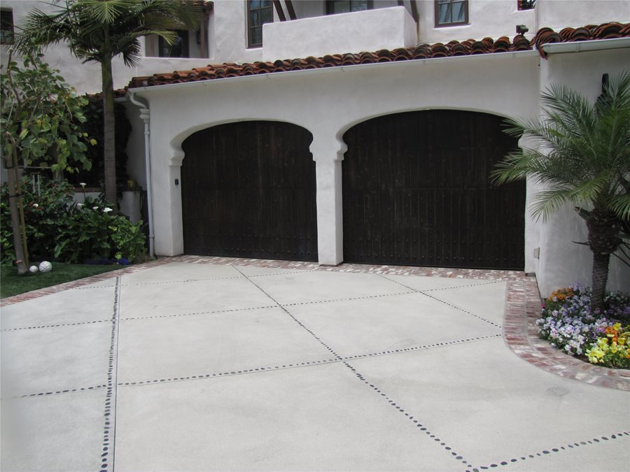 If you want an eclectic, natural look try embedding a scattered array of stones into the surface of your concrete driveway. For this driveway, the stones were inserted into the wet concrete after it was poured. To complete the look, similar stones were spread along the edges of the driveway. Warning: If the stones rise too far above the surface of the driveway they could be knocked loose by vehicle tires leaving an empty hole.
