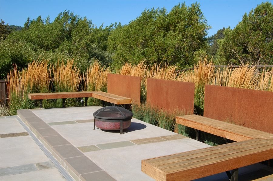 Another way to upgrade freshly poured concrete is to lay irregular flagstones in select areas. On this patio, warm colored flagstones soften the transition between the patio and the stairs and bench. While adding flagstone to the concrete will increase your cost, it will be nowhere near as expensive as paving your entire patio in stone. Make sure that the pieces of stone are installed completely flush with the concrete to avoid tripping hazards.