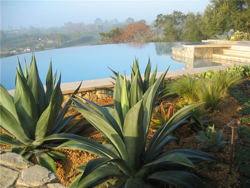 The use of agaves and other plants with strong architectural qualities creates a stark contrast when viewed against the water in the background. The entire garden was top dressed with light-colored gravel to reinforce continuity.