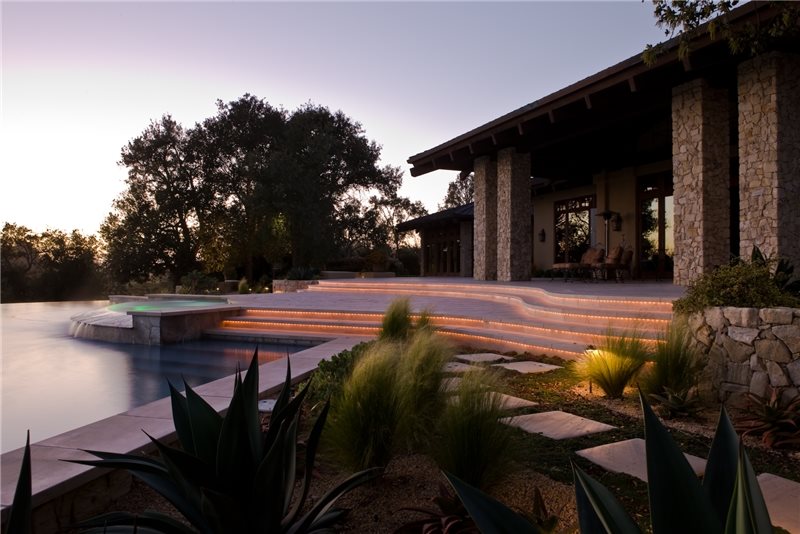 - Features: Vanishing-edge pool, succulent garden, stone pathway, irrigation system, low-voltage landscape lighting, curved steps