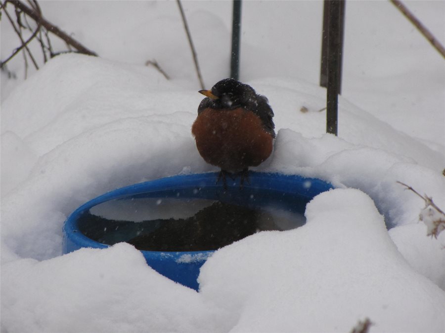Next, provide a winter water source for birds. In areas where it snows all winter, all the available water can freeze, which makes finding drinking water a challenge for birds. You can ensure regular visits from a variety of birds by using a bird bath with a warmer, or even a simple heated dog bowl to provide a steady source of water. However, it's important to put a layer of sticks or stones over the dish so birds can drink from the water but not take a bath, which can be dangerous when temps go below 20 degrees Fahrenheit (for more information read How to Provide Water for Birds When the Birdbath Freezes).