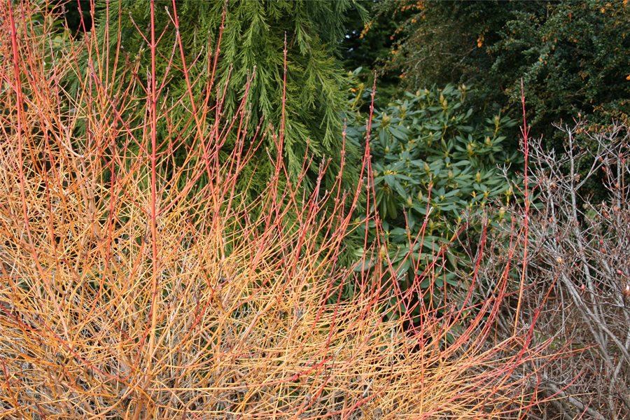 Colored-twig dogwoods (Cornus sericea) are also a fantastic choice for winter color. When they lose their leaves, they reveal bright red, yellow, or orange stems that show off well against a backdrop of dormant grasses or evergreen shrubs. And the display's not limited to outdoors, either, since the cut stems last a long time in a vase or a holiday wreath. Colored-twig dogwoods grow in full sun to part shade and reach about 4-10' tall and wide, depending on the variety. Check out 'Midwinter Fire' for sunset-colored stems and a dwarf growth habit, 'Elegantissima' for cream-variegated leaves in summer and blood red stems in winter, or 'Hedgerows Gold' which lights up the garden with golden-edged leaves in summer and yellow stems in winter.