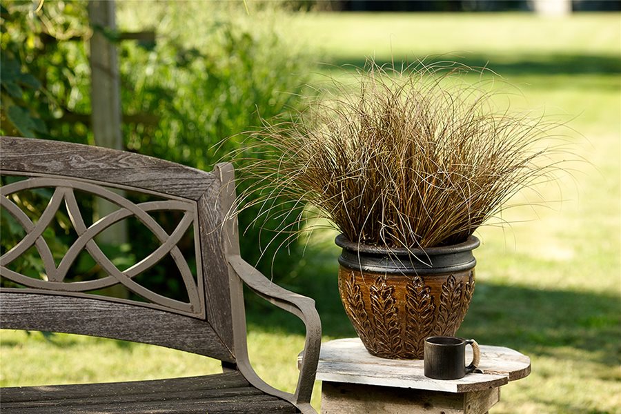 Ornamental grasses make a great centerpiece for a winter container planting, and not only the evergreen varieties. Many grasses go dormant gracefully, leaving a fluffy mass of brown strands that look surprisingly at home among winter annuals and other color. Evergreen grasses include sedges like Carex 'Toffee Twist', variegated sweet flag (Acorus gramineus 'Variegata'), and silver spear (Astelia chathamica 'Silver Spear'), while fountain grass (Pennisetum) and dwarf varieties of maiden grass (Miscanthus) make a great show in dormancy.